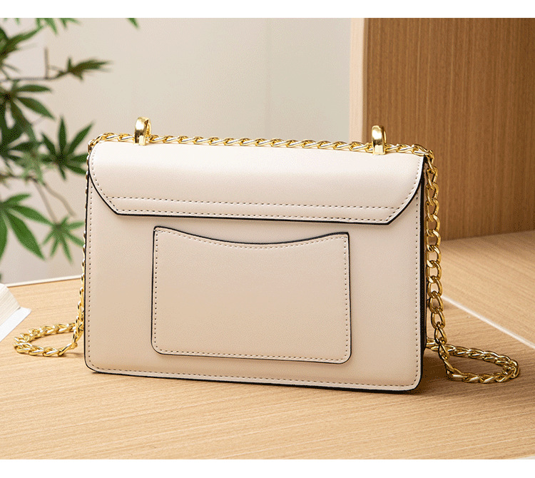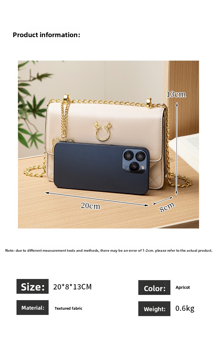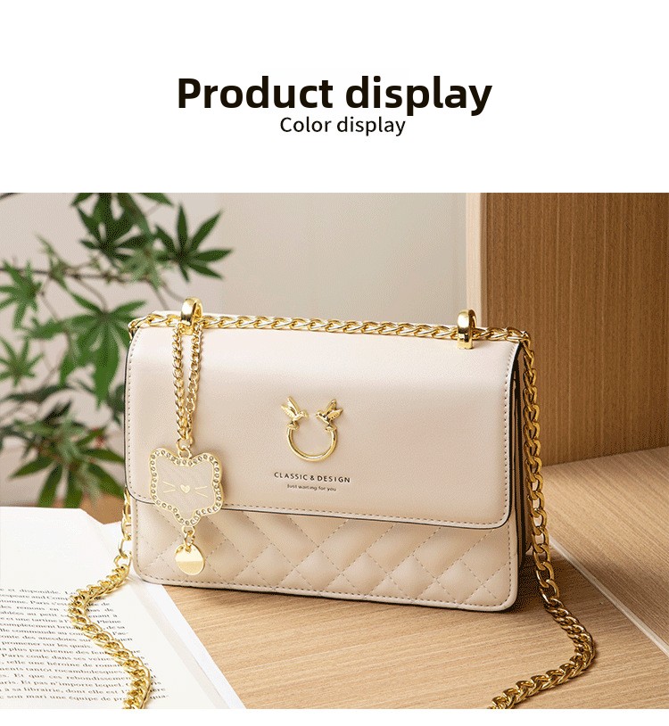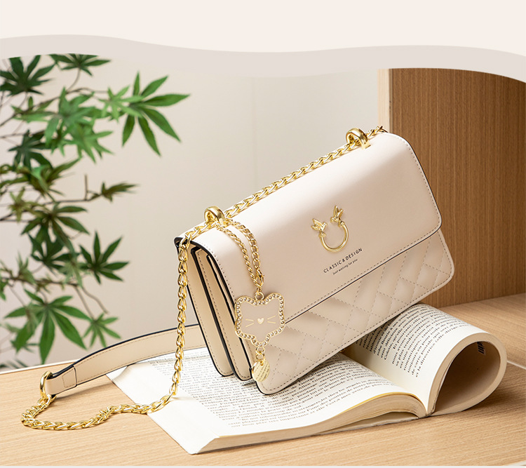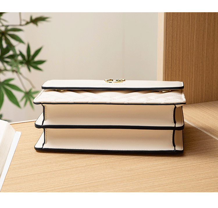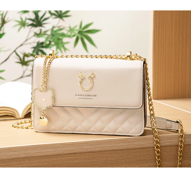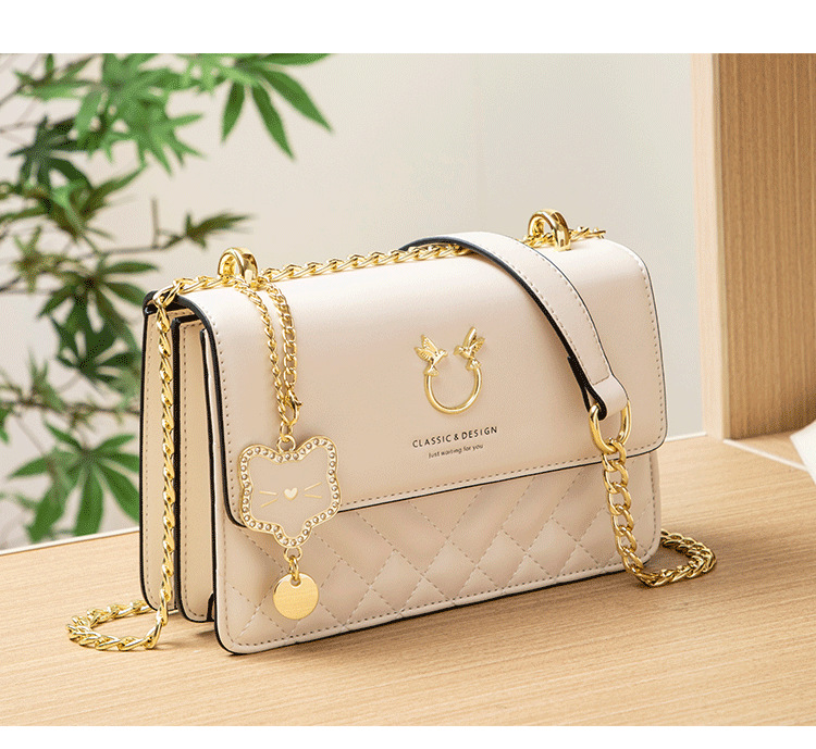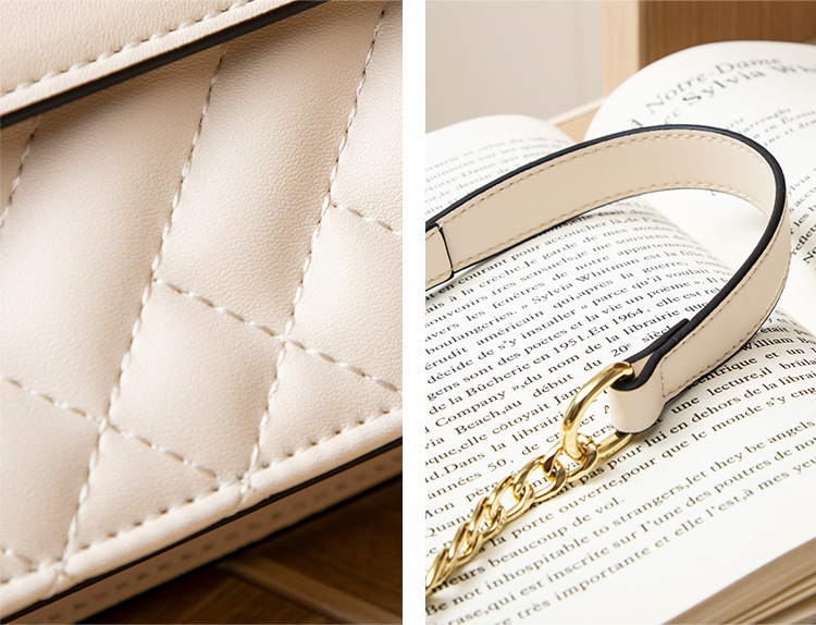 Elegant Design: Stylish small square bag with embroidered diamond pattern and chain detail.