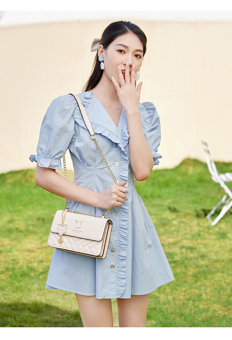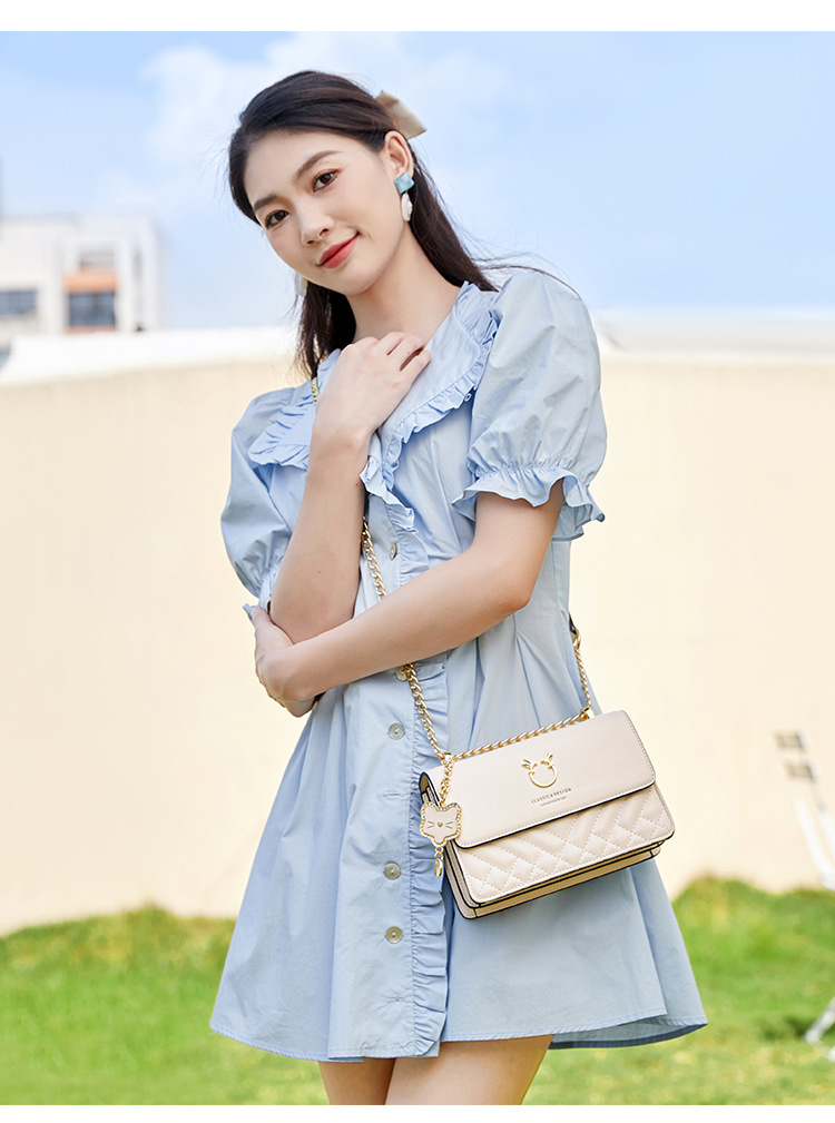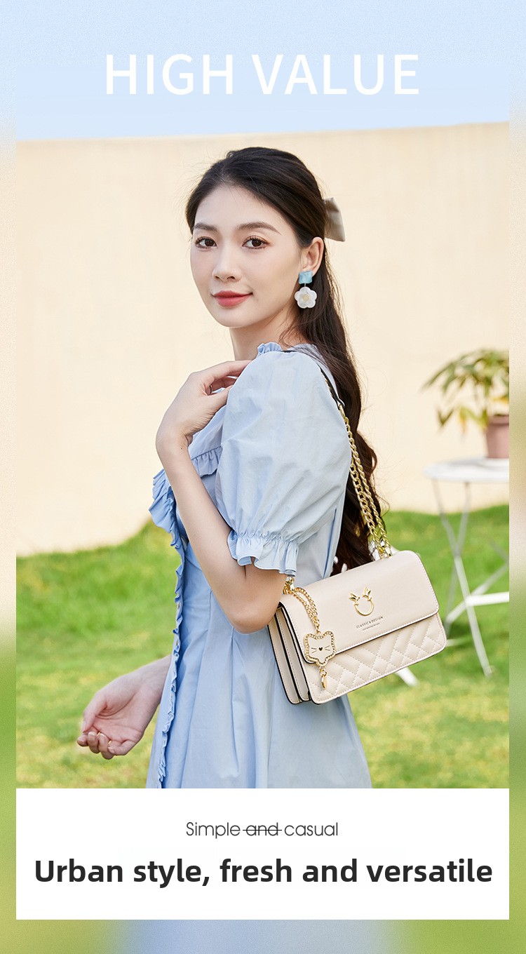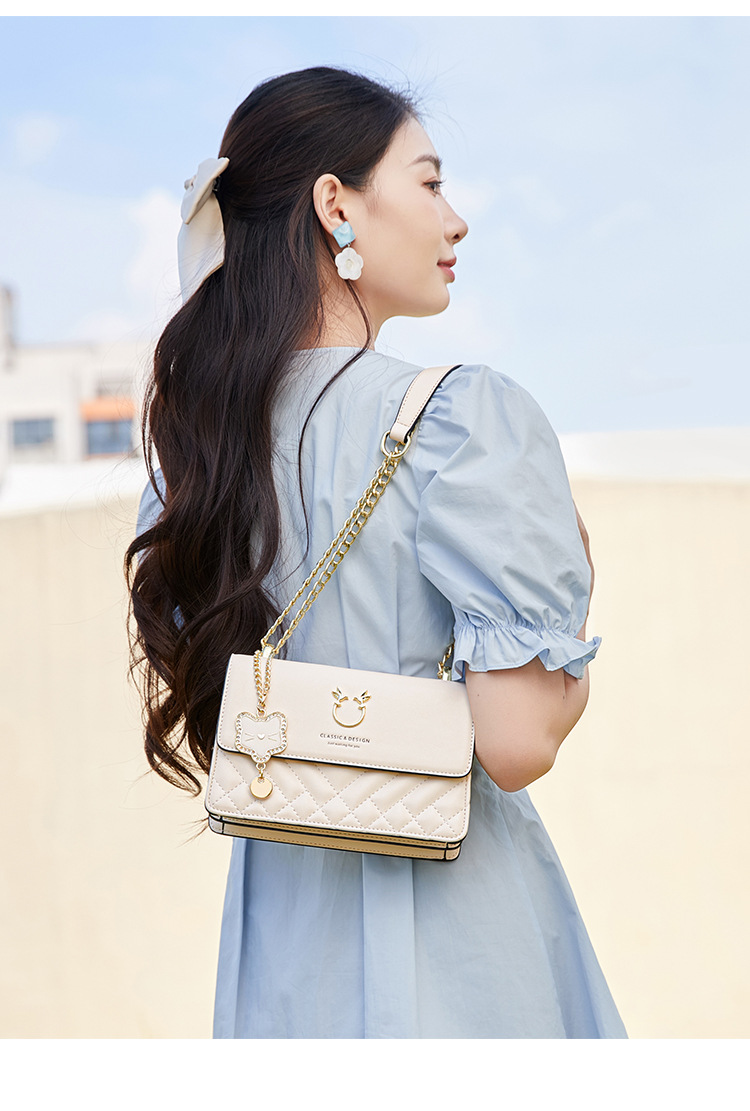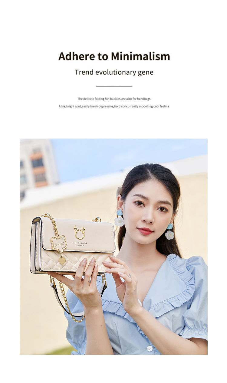 Elegant Design: Stylish small square bag with embroidered diamond pattern and chain detail.
