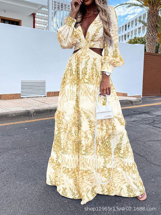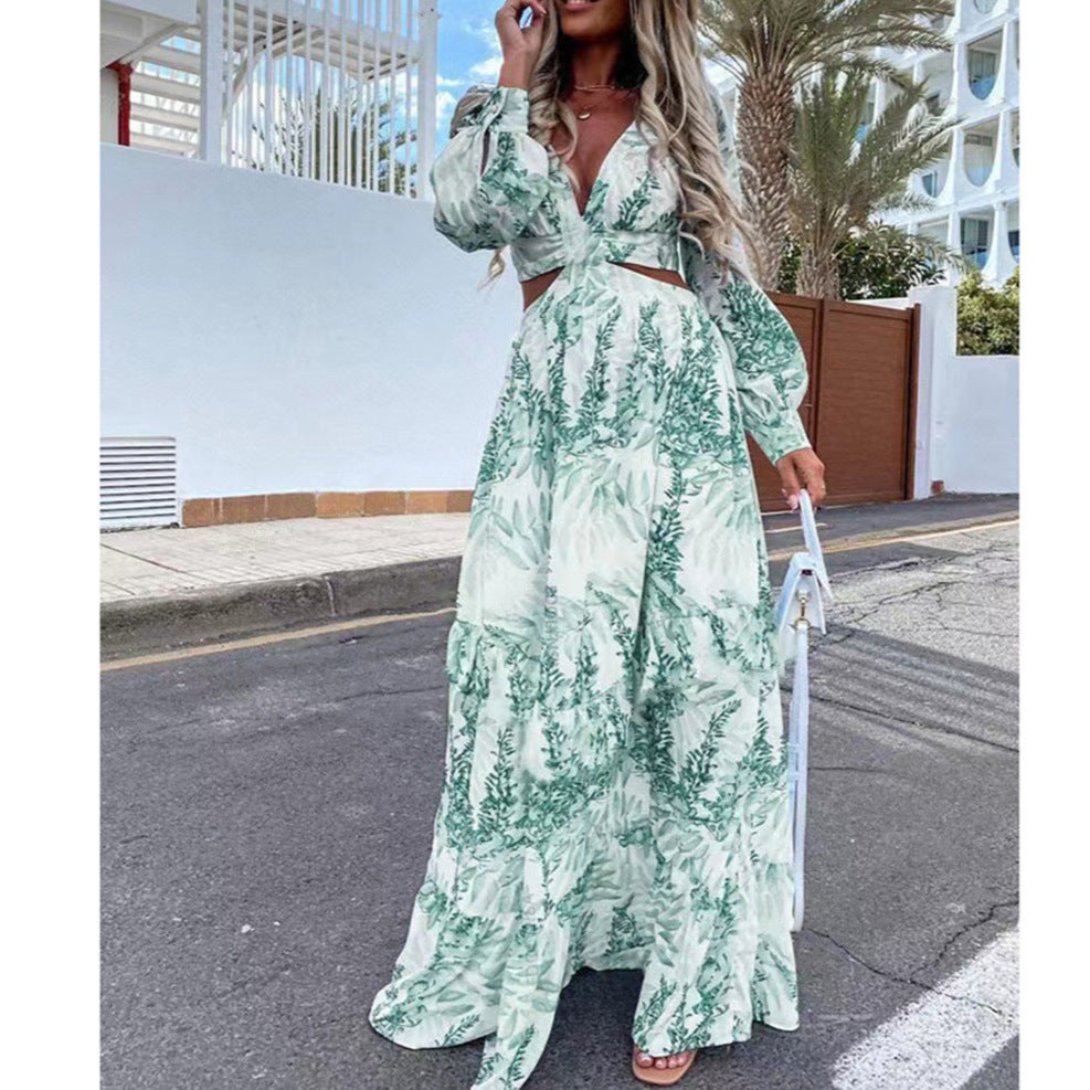 Embrace timeless charm with this long floral V-neck dress, designed to turn heads all season. The vivid plant print radiates a breezy, high-end vibe—perfect for spring and summer getaways. -