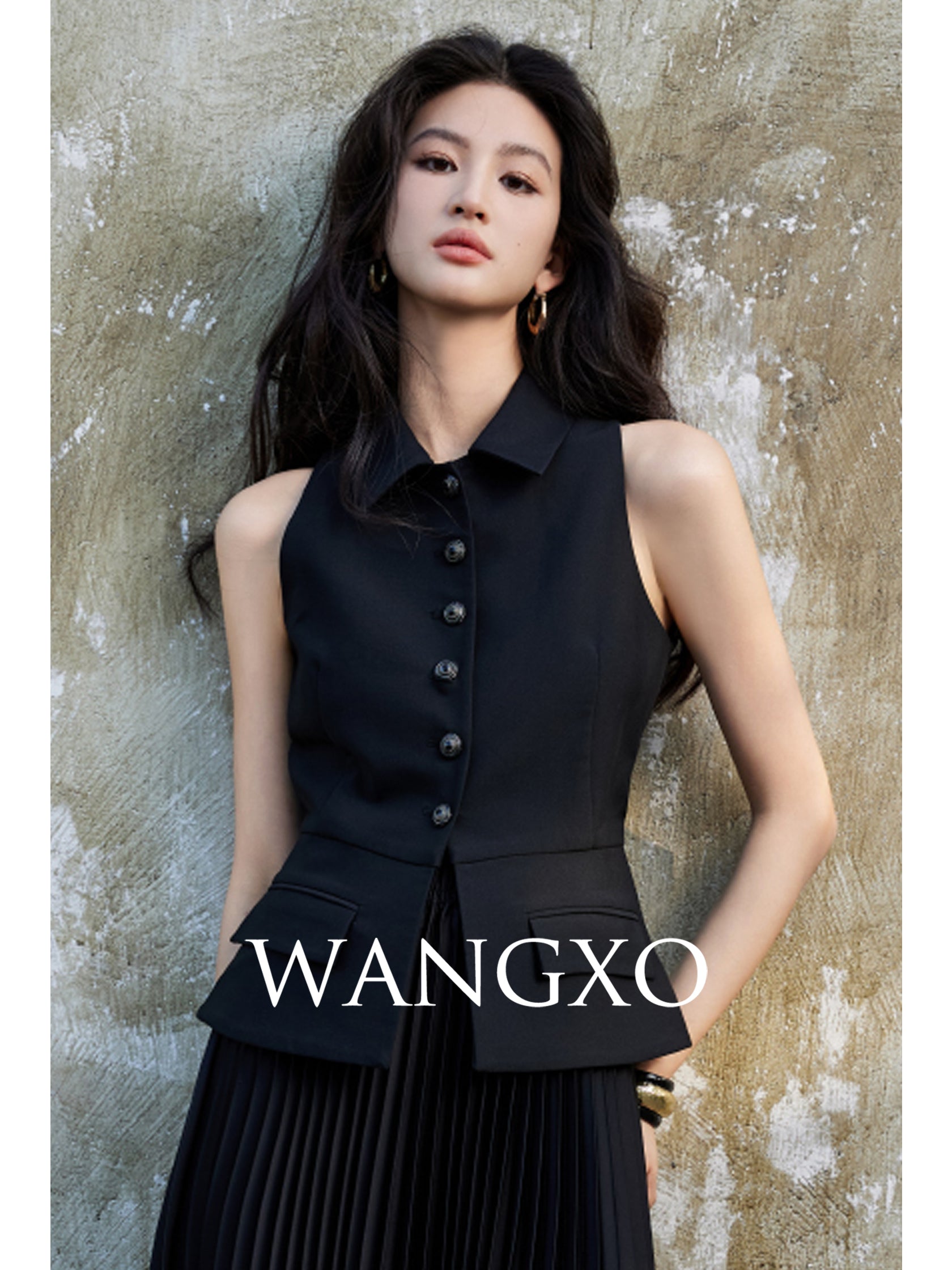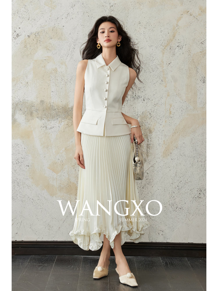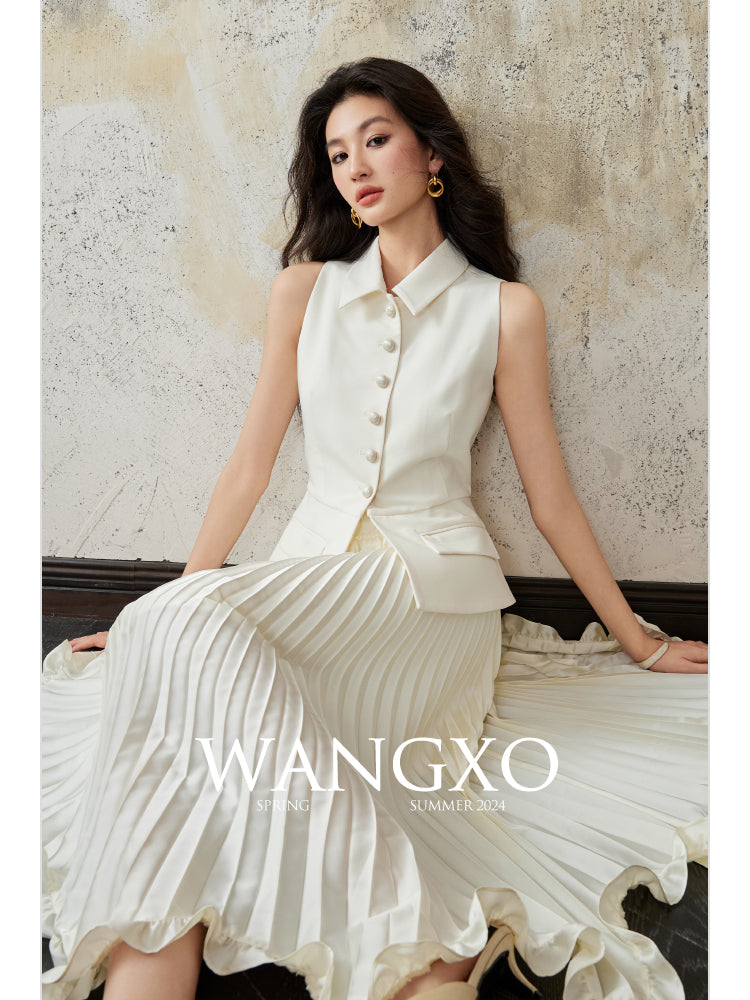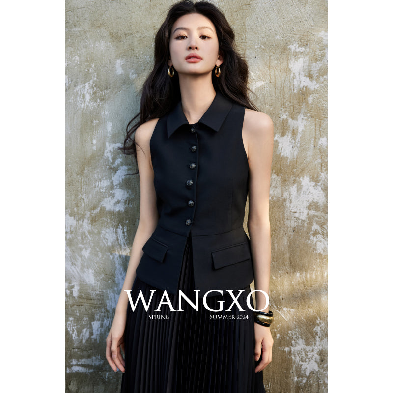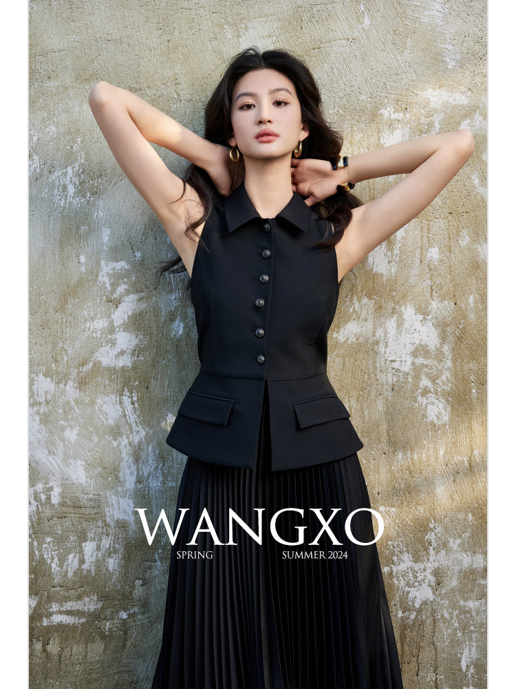 This exquisitely tailored sleeveless collared vest is a fashion masterpiece.